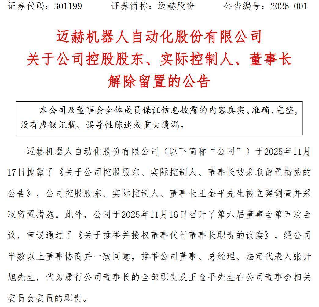 迈赫股份2025年11月16日晚间公告,公司于近日收到山东枣庄市薛城区监察委员会签发的《立案通知书》和《留置通知书》,公司控股股东、实际控制人、董事长王金平被立案调查并采取留置措施。在王金平被留置不能履行董事长职责期间,迈赫股份暂由公司董事、总经理、法定代表人张开旭代为履行公司董事长职责。