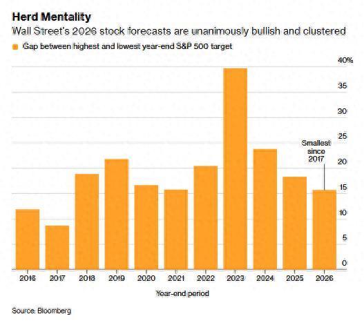 盈透证券首席策略师Steve Sosnick表示:“预测如此高度一致和集中让我感到担忧。如果所有人都预期相同,那么这种预期必然已体现在当前股价中——尤其是当共识背后的逻辑大多建立在降息、减税和AI持续主导等相似逻辑之上时。”
